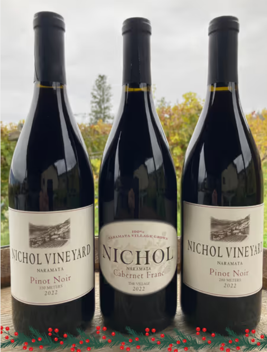 This year, celebrate the holiday with Nichol! This festive bundle includes two bottles of their 2022 Pinot Noir 550 Meters, two bottles of their 2022 Pinot Noir 280 Meters, and two bottles of their 2022 Cabernet Franc Village.